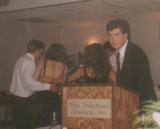 Many don't know this, but Northern Iowa's own Troy Beam is currently serving in the House of Representatives. This first picture shows Rep. Beam(R) and his aides after narrowly failing to add the words, "-and for being such a pervert" to the 3rd Article of Impeachment. This next picture was given to me by someone from the mailroom at the magazine company, Hustler. Larry Flint is reportedly going to release this early photo of Troy Beam along with a young Newt Gingrich. Nothing is known about the photo, but do take note of the lipstick on Newt!